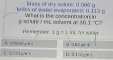 Next, we need to find the volume of the solvent in milliliters. The problem gives us the mass of the water that was evaporated, which is 0.113 grams. This evaporated water was the solvent in the original solution. The question requires the volume of the solvent, not its mass. To convert the mass of water to volume, we use the provided density information: 1 gram of water is equivalent to 1 milliliter of water. Therefore, a mass of 0.113 grams of water has a volume of 0.113 milliliters. This value will be the denominator in our calculation. The temperature of 30.1 °C is extra information and is not needed for this specific calculation.