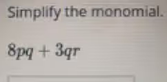 The problem asks to simplify the given expression, 8pq + 3qr. In algebra, simplifying an expression often involves combining “like terms.” Like terms are terms that contain the exact same variables raised to the exact same powers. The numerical coefficients of the terms can be different.