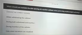 The correct and safe procedure for performing oropharyngeal suctioning requires that suction is applied only during the withdrawal of the catheter. The side opening on a suction catheter, often called a thumb port, acts as a control valve. When this port is left open, suction is not actively pulling through the tip of the catheter.