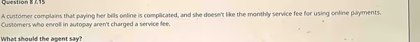 The provided scenario requires the agent to address two distinct customer complaints: the complexity of the online payment system and the dislike of the associated monthly fee. The optimal response must resolve both issues efficiently and leave the customer feeling heard and satisfied. The key to this is using the information that customers enrolled in autopay are not charged a service fee.