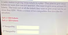 The first condition states that the radio station wants to give away “at least 20 tickets.” The phrase “at least” means 20 is the minimum number, so the total number of tickets can be 20 or more. The total number of tickets is the sum of the $10 tickets (x) and the $20 tickets (y). Therefore, we can express this relationship using a “greater than or equal to” symbol (≥). This gives us our first inequality, which represents the constraint on the quantity of tickets: x + y ≥ 20.