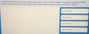 Now, to find the expected gain or loss, we must subtract the cost of the ticket from this average prize value. Each ticket costs $2.