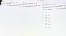 - (1, 1.5): This is not a reasonable solution because y is not a whole number. A snack bar cannot sell 1.5 bottles of water.