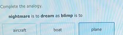 The other options are incorrect because they do not fit this pattern. A “boat” is a vehicle for water travel, so a blimp is not a type of boat. A “plane” is also a specific type of aircraft, just as a blimp is. Choosing “plane” would be analogous to saying “nightmare is to lucid dream,” which compares two specific types within the same category rather than a specific type to its general category. The analogy requires the overarching classification, which is aircraft. Thus, the completed analogy reads: nightmare is to dream as blimp is to aircraft.