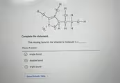 If we analyze the provided structure of the vitamin C molecule, specifically its anionic form called ascorbate, we can count the bonds on the two carbon atoms where the bond is missing. The carbon atom on the left side of the gap is currently shown with two single bonds: one to an oxygen atom carrying a negative charge and one to the adjacent carbon atom of the carbonyl group. To reach the required four bonds, it needs two more. Similarly, the carbon atom on the right side of the gap is also shown with two single bonds: one to a hydroxyl group (OH) and one to the neighboring carbon in the ring. This atom also needs two additional bonds to become stable.