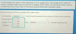 The inequality x ≤ 324 can be used to represent the number of slots in the book that may be filled with baseball cards. A graph of this inequality would have a closed circle at 324 and be shaded to the left.