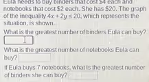 For the final question, we are told Eula buys 7 notebooks. We can calculate the cost of these notebooks, which is 7 multiplied by $2, for a total of $14. We substitute y = 7 into the inequality to find out how many binders she can afford with her remaining money. The inequality becomes 4x + 2(7) ≤ 20, or 4x + 14 ≤ 20. Subtracting 14 from both sides gives 4x ≤ 6. Dividing by 4 gives x ≤ 1.5. Since Eula cannot buy half a binder, the greatest whole number of binders she can buy is 1.