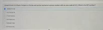 To find the correct National Provider Identifier (NPI) number for Dr. Joseph Brown, it is necessary to cross-reference the information provided in the question with a public database. The key details are the provider’s name (Joseph Brown), his specialty (Plastic Surgeon), his location (Florida), and the clue that his phone number has an 813 area code.