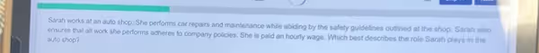 The description of Sarah’s position at the auto shop provides several key indicators that point directly to her role as an employee. Her primary function involves performing the hands on labor of car repairs and maintenance. This is the fundamental service provided by the business, and Sarah is the person who directly executes this work on behalf of the company. She is not described as managing others or setting strategic direction; instead, she is a crucial part of the operational team responsible for service delivery to customers.