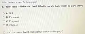 While the other options are related to the body’s overall health, they are not the most direct answer. The pancreas (B) is the organ responsible for producing insulin to regulate glucose, so an unhealthy pancreas could be the root cause of the problem. However, the unhealthy glucose level itself is the immediate physiological state causing the symptoms. The gut (A) plays a role in nutrient absorption and has a known connection to mood through the gut-brain axis, but the link to the specific combination of tiredness and irritability is most strongly and directly associated with energy metabolism and glucose. Lastly, enzymes (C) are proteins that facilitate all biochemical reactions, including the breakdown and use of glucose. While a specific enzyme deficiency could be an issue, “enzymes” as a general category is too broad; the problem described points more specifically to the end result of these metabolic processes, which is an unhealthy level of glucose. Therefore, unhealthy glucose regulation is the most precise explanation for John’s symptoms.