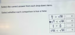 For the first comparison, 31/4 > √35, we can convert the fraction to a decimal. 31 divided by 4 equals 7.75. For the other side, we need to estimate the square root of 35. We know that the square root of 36 is 6, so the square root of 35 must be a number slightly less than 6, approximately 5.92. Comparing the two values, 7.75 is clearly greater than 5.92. Therefore, the statement is true.