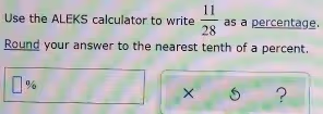 Use the ALEKS calculator to write 11/28 as a percentage.