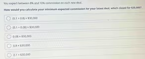 Now, you have the two numbers needed for the calculation: the deal amount ($30,000) and the minimum commission rate in decimal form (0.08). The correct formula is to multiply these two values together. This gives you the expression: 0.08 * $30,000.
