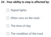 Let’s consider the other options. Signal lights tell you when to stop, but they do not affect the physical process of stopping. Other cars on the road are hazards that necessitate stopping, but they don’t change your car’s braking performance. The time of day can affect your visibility, which might increase your reaction time, but the condition of the road itself directly governs the fundamental physics of how effectively your brakes can work. Therefore, the road’s condition is the most critical factor listed that affects your stopping ability.