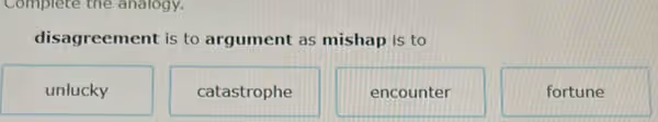 This analogy is based on a relationship of degree and intensity. To find the correct answer, we must first identify the relationship between the words in the first pair, “disagreement” and “argument,” and then apply that same relationship to the second pair, which starts with “mishap.”