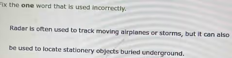“Stationery,” spelled with an “er,” is a noun that refers to writing materials and office supplies. This includes items like paper, pens, pencils, and envelopes. For example, one might say, “The office manager ordered new stationery for the company.” In the context of the original sentence, radar is not used to locate buried office supplies specifically, but rather any object that is not in motion.