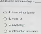 Option A, “intermediate Spanish,” describes a specific course that is part of a language learning sequence. The major itself would be Spanish, and “intermediate Spanish” would be one of the many classes a student might take to earn that degree.