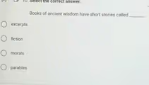 The other options are incorrect for specific reasons. An excerpt is simply a selected portion of a larger text; it describes how a piece of writing is presented, not what kind of story it is. Fiction is a very broad term for any narrative that is not strictly factual. While parables are typically fictional, the term “fiction” does not capture their specific didactic, or teaching, purpose. A modern mystery novel is fiction, but it is not a parable. Finally, a moral is the lesson or principle that a story teaches. The parable is the story itself, while the moral is the conclusion or message derived from it. For example, a story might convey a moral about the importance of honesty, but the story itself is not called “a moral.” Therefore, parable is the most precise and fitting term for the short, instructive stories found in books of ancient wisdom.