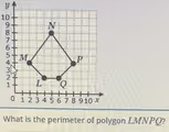 To find the perimeter of the polygon, we must calculate the length of each of its five sides and then add these lengths together. The polygon is on a coordinate plane, so we can determine the coordinates of each vertex first: L is at (4, 2), M is at (2, 4), N is at (5, 8), P is at (8, 4), and Q is at (6, 2).