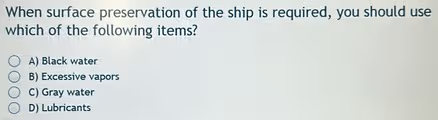 The other options are incorrect. Black water is wastewater from toilets, and gray water is from sinks and showers; both are corrosive, contain contaminants, and are pollutants that must be managed, not used for preservation. Excessive vapors, whether from fuel, chemicals, or humidity, are generally hazardous and can contribute to corrosion rather than prevent it. Therefore, of the choices provided, only lubricants serve as a necessary item for the surface preservation of a ship.