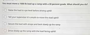 The other options are incorrect because they are extremely dangerous. Raising the load to eye level makes the forklift top heavy and far more unstable. Backing up the ramp with the load would place the load on the downhill side, making a backward tip over almost certain. While driving slowly with the load facing uphill is the correct technique for a safe incline, it does not negate the inherent danger of a 20 percent grade, which is likely beyond the machine’s design limits.