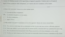 For part (a), the goal is to identify the conclusion of the statement. An argument consists of a premise (the evidence) and a conclusion (the point being argued). The word “so” is a conclusion indicator, signaling that what follows is the main claim. The premise is “Apple’s iPhone outsells all other smartphones.” This is the factual evidence being presented. The conclusion, which follows “so,” is the assertion that “it must be the best smartphone on the market.” Therefore, option B correctly identifies the argument’s conclusion. The other options are incorrect because they represent the premise, the subject, or a part of the premise.