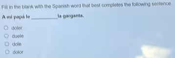 - dolor: This is a noun that means “pain.” The sentence needs a verb to describe the action of hurting.