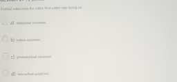 The other options are incorrect. While industrial societies saw the rise of mass public education, this was a much later development aimed at creating a disciplined workforce, and it followed centuries of established formal education for the elites. The term urban societies is too general, as many preindustrial societies had major urban centers where this elite education occurred. The correct answer, preindustrial societies, more accurately describes the specific societal type and historical era in which formal education originated as an exclusive institution for the ruling class.
