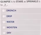This analogy is built on a relationship of intensity or degree. To solve it, we must first identify the connection between the words in the first pair, GLIMPSE and STARE, and then apply that same relationship to the second pair, starting with SPRINKLE.