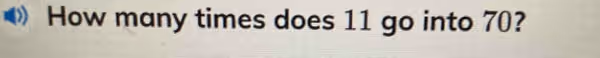 The very next multiple, 11 times 7, is 77, which is larger than 70. Since 66 is the highest multiple of 11 that is less than 70, we can conclude that 11 fits into 70 a total of six complete times.