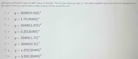 This equation accurately models the car’s value, y, starting at $35,000 and decreasing by 7.5% each year for x years. Comparing our result to the given options, it perfectly matches option a. Option c, with a factor of (1.075), would incorrectly represent an annual increase in value, or appreciation. Other options either misuse the initial value and rate or use an incorrect decay factor.