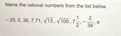 The rational numbers from the list are: -20, 0, 36, 7.71, √100, 7 1/2, and -2/39.