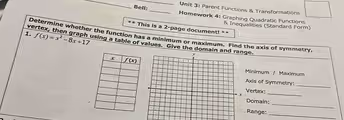 The problem asks for a complete analysis of the quadratic function f(x) = x² – 8x + 17. This function is in the standard form f(x) = ax² + bx + c, where a = 1, b = -8, and c = 17.