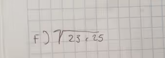 The image displays a mathematical problem asking for the square root of 23.25. The expression is written as F) followed by a radical symbol (√) covering the number “23,25”. In many regions outside of the United States, a comma is used as a decimal separator, so the problem is to calculate √23.25.