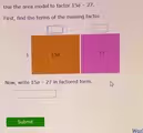 The area model is a visual tool for understanding factoring, which is closely related to the distributive property. In this problem, the expression to be factored is 15a – 27. The total area of the combined rectangle represents this expression. The height and the total length of the rectangle represent its factors.