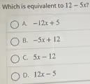 If we rearrange 12 – 5x by putting the -5x term first, followed by the +12 term, we get -5x + 12. This new expression is mathematically identical to the original one; it is simply written in a different order. This matches option B perfectly.