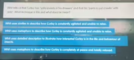 The meaning of these metaphors is crucial to understanding Curley’s character. The imagery of being infested with yellow jackets and ants evokes a powerful sense of irritation, extreme discomfort, and an inability to be still. It perfectly encapsulates Curley’s constant agitation and pugnacious nature. He is a character defined by his restlessness and insecurity, always itching for a fight to prove his dominance, a condition known as a Napoleon complex. He is never calm or at peace. These metaphors effectively communicate his inner turmoil and aggressive energy to the reader, portraying him as a person who is perpetually on edge and uncomfortable in his own skin. The other options are incorrect because one misidentifies the technique as a simile, another completely misinterprets the figurative language as a literal interest in insects, and the last option suggests the exact opposite of Curley’s agitated state.