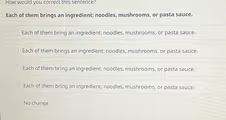 Second is the correct use of the colon. A colon is used to introduce a list, an explanation, or a quotation that follows an independent clause. An independent clause is a complete thought that can stand on its own as a sentence. The clause “Each of them brings an ingredient” is a complete sentence. It has a subject (“Each”) and a verb (“brings”) and expresses a full idea. Therefore, placing a colon after this clause to introduce the specific list of ingredients (“noodles, mushrooms, or pasta sauce”) is the proper punctuation.