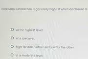 Relational satisfaction is generally highest when disclosure is at a moderate level because this achieves a critical balance between intimacy and personal privacy. This concept is often described by a curvilinear model, which suggests that satisfaction is low when disclosure is either too low or too high, and peaks somewhere in the middle.