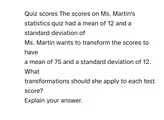 The scores on Ms. Martin’s statistics quiz had a mean of 12 and a standard deviation of 3.