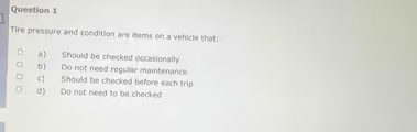 The other options are incorrect for significant safety reasons. Option (d), suggesting they do not need to be checked, is dangerously false. Tires naturally lose pressure over time and are susceptible to damage. Likewise, option (b) is incorrect because tire inspection is a core component of regular vehicle maintenance. Option (a), checking them “occasionally,” is too vague and inadequate. A tire can lose a critical amount of pressure or sustain damage in a short period. A slow leak could cause a tire to become dangerously underinflated between occasional checks, leading to poor handling, increased fuel consumption, and a significantly higher risk of a blowout due to heat buildup.