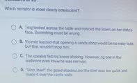 In contrast, the other options display more limited perspectives. Option A is an example of third person limited narration. The story is filtered through Ting’s perspective; we see what she notices and know her interpretation of the situation. We do not actually know what her date is thinking. Option B is also third person limited, focusing exclusively on Vicente’s thoughts and resolve. We are inside his mind, but no one else’s. Option D uses a third person objective perspective, where the narrator reports only external actions and dialogue, like a camera, without revealing the thoughts or feelings of either the guard or the thief. Therefore, option C is the only choice that demonstrates true omniscience.