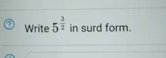 To write the expression 5^(3/2) in surd form, we need to understand the relationship between fractional exponents and radicals. The general rule for converting a fractional exponent to a surd is x^(a/b) = ᵇ√(xᵃ). In this rule, ‘x’ is the base, ‘a’ is the numerator of the exponent, and ‘b’ is the denominator of the exponent. The denominator ‘b’ becomes the index of the root, and the numerator ‘a’ becomes the power of the base inside the root.