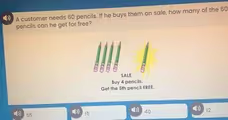 Therefore, out of the 60 pencils the customer needs, 12 of them will be free. We can also verify this. If 12 pencils are free, then the customer must pay for the remaining 48 pencils (60 total pencils minus 12 free pencils). This works out perfectly with the sale, as 12 groups of 4 paid pencils each (12 × 4) also equals 48. The logic is consistent, confirming that the customer gets 12 pencils for free.