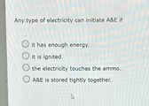 The other options are incorrect for specific reasons. The idea that electricity must “touch” the ammo is an oversimplification; an electrical arc can jump a gap to transfer energy without direct contact. The statement “it is ignited” is nonsensical, as electricity is the source of ignition, not something that is itself ignited. Lastly, while storing A&E tightly together is a major safety concern related to sympathetic detonation (where one explosion triggers others), it does not describe the condition needed for the initial electrical initiation. Therefore, the presence of sufficient energy is the universal requirement for any electrical source to initiate A&E.