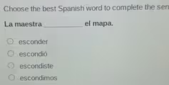 1. esconder: This is the infinitive form of the verb, meaning “to hide.” Infinitives cannot serve as the main verb of a sentence without an auxiliary verb. Using it would create the grammatically incorrect sentence “The teacher to hide the map.”