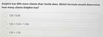 To understand why this is the correct choice, let’s break down the problem. The question states that Dolphin has “50% more clients than Turtle does.” The formulas provided use the number 120, so we can assume that Turtle has 120 clients.