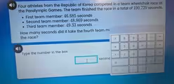 The second and final step uses this combined time to find the fourth athlete’s individual time. We know from the problem statement that the team’s total finishing time for the entire race was 190.729 seconds. Since this grand total is the sum of the times of all four athletes, we can find the fourth person’s time by subtracting the combined time of the first three athletes from this total. The specific calculation is 190.729 seconds (the total team time) minus 144.884 seconds (the combined time of the first three). The result of this subtraction is exactly 45.845. Therefore, the fourth team member completed their leg of the team wheelchair race in 45.845 seconds, which was the final contribution to the team’s total time.