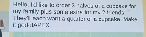 To find the grand total for the entire order, we combine the family’s share and the friends’ share. We add the one and a half cupcakes (1.5) for the family to the half cupcake (0.5) for the friends. The sum of 1.5 and 0.5 is 2. The entire order, therefore, amounts to exactly two whole cupcakes. The final sentence, “Make it godofAPEX,” seems to be a username or a special request for personalization and does not affect the mathematical calculation of how many cupcakes are needed.