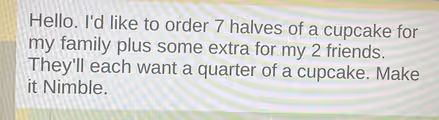 To determine the final answer, we simply add the two calculated amounts together. We combine the family’s 3.5 cupcakes with the friends’ 0.5 cupcakes. The sum of 3.5 and 0.5 is exactly 4. Therefore, the total number of cupcakes to be prepared is four. The final line, “Make it Nimble,” is a classic element of a riddle, intended to be a playful misdirection or an irrelevant instruction that does not impact the mathematical logic of the problem itself. The core of the puzzle is the arithmetic.
